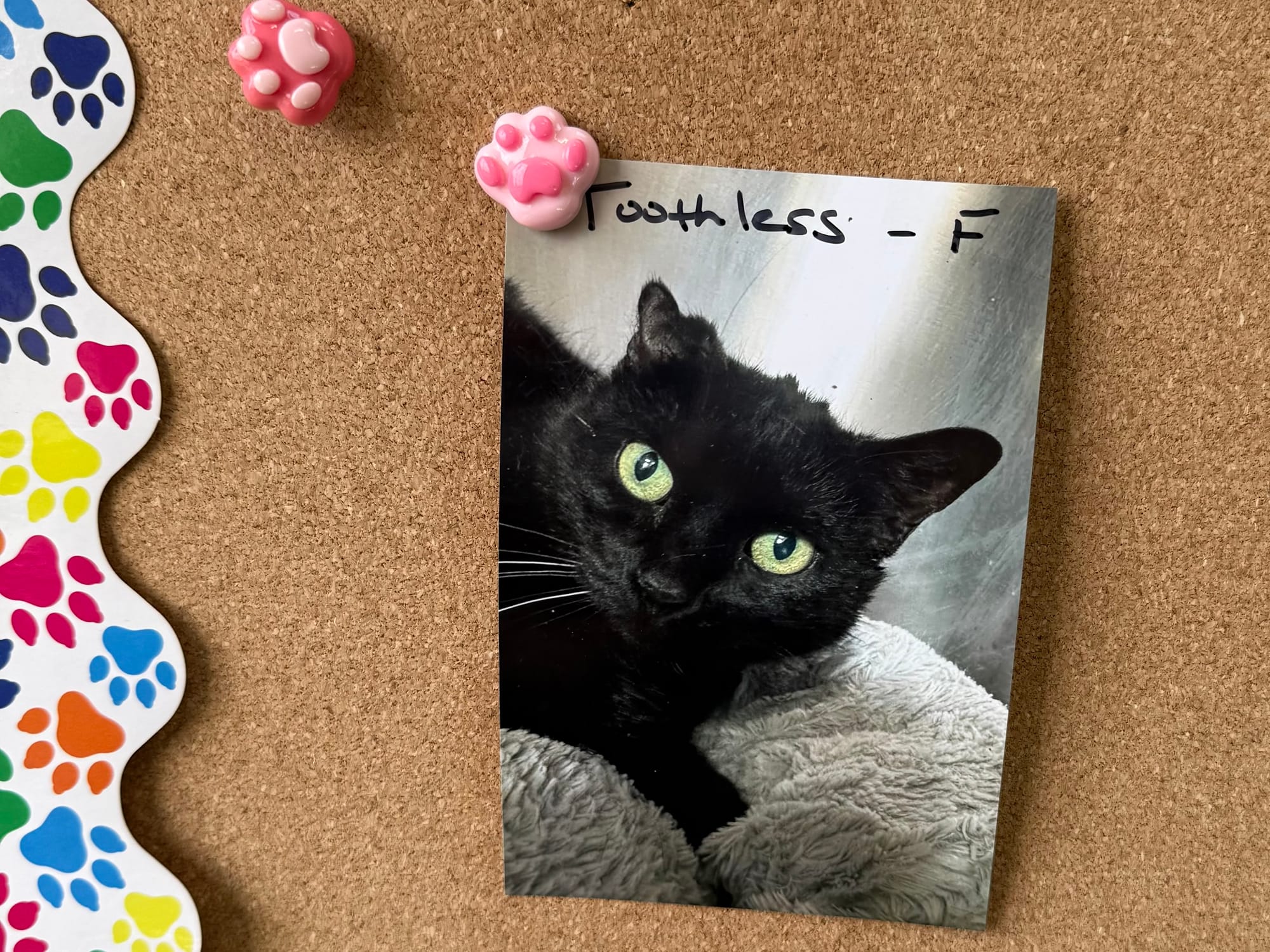Cats and kittens from a recent intake; donations from the Amazon Wish List; another cat, known as 'Toothless' who is available for adoption now; dedication plaque and signage in honor of community members.