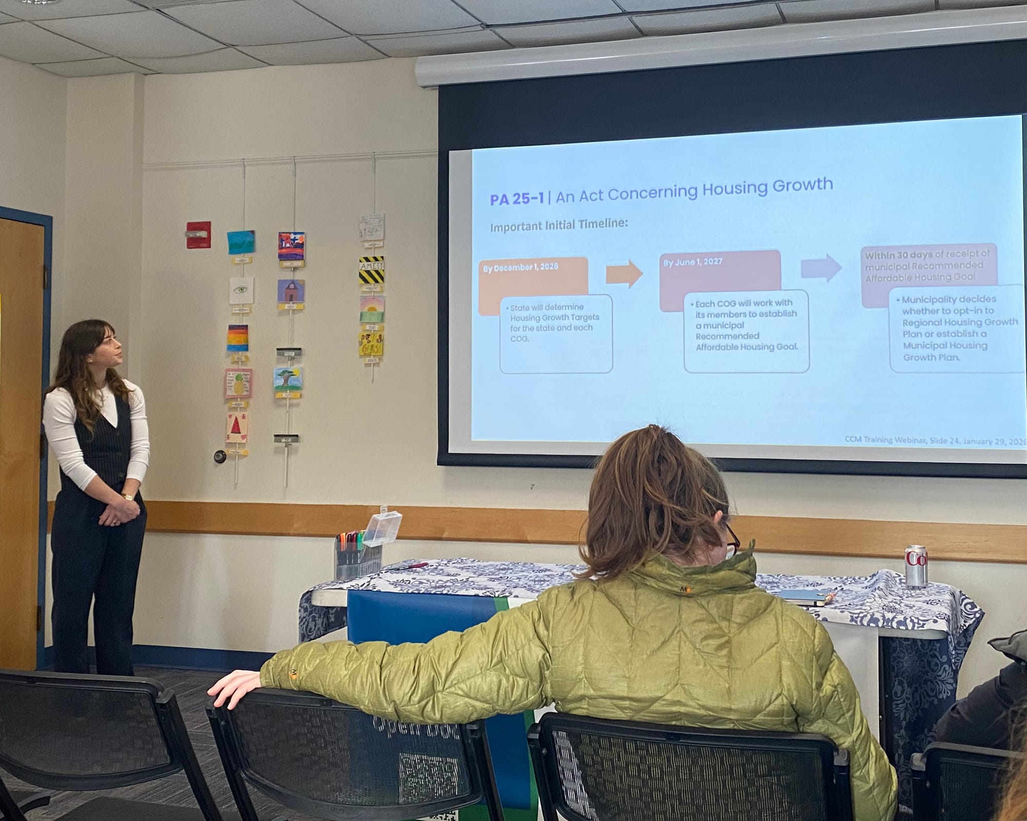 Marrella also referenced a presentation hosted the previous day by the Connecticut Conference of Municipalities (CCM) that reviewed the state’s new housing law adopted during the 2025 special legislative session, Public Act 25-01. Slides from that presentation, one of which was displayed during the roundtable (see above), outlined an initial timeline under the new law, including the state’s role in setting housing growth targets, the development of recommended affordable housing goals through councils of governments (COGs), and subsequent municipal decisions on whether to participate in a regional housing growth plan or establish a local plan. It was noted that Woodbridge is part of the South Central Regional COG — more information is available on the SCRCOG website, including a guide to public participation published in 2025.