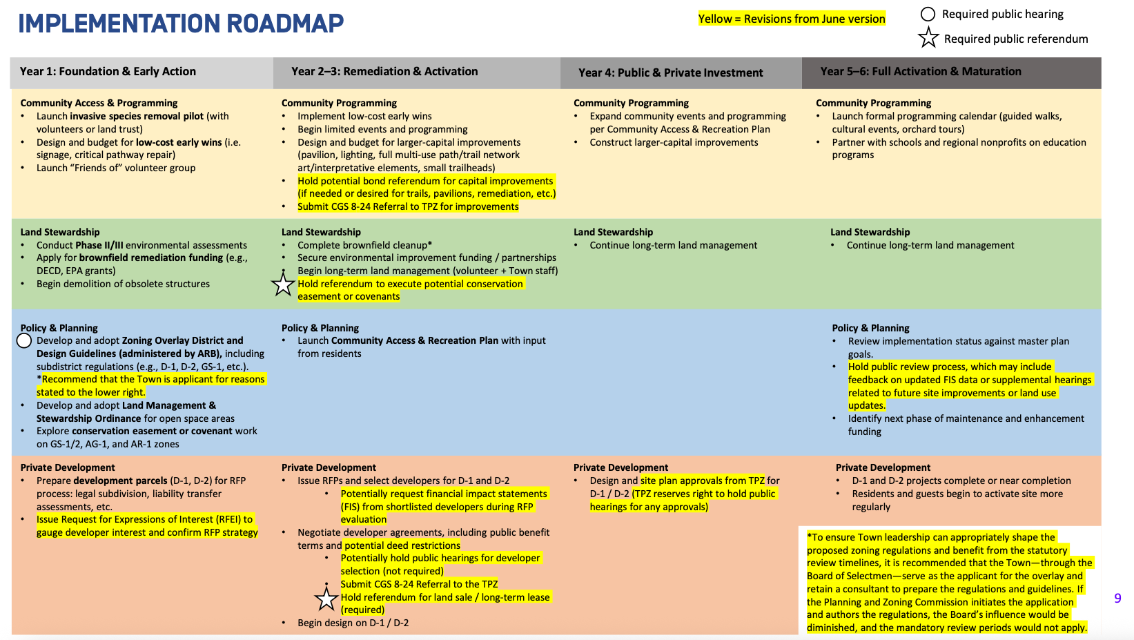 The Board also heard a final presentation from Cooper Robertson, the consultant firm leading the master planning process for the former Country Club of Woodbridge (CCW) parcel. The update included final cost-benefit estimates, a proposed approach to public engagement, and a detailed timeline for next steps, labeled as the “Implementation Roadmap” (see slide, below). The discussion touched on the potential integration of the CCW process with the broader POCD goals, and a commitment to ensuring public input as central to the planning process as it moves forward.