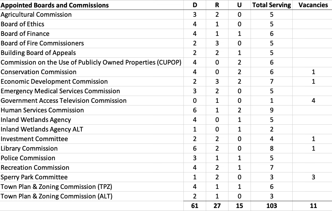 This composition represents a strong Democratic majority across appointed bodies, with Unaffiliated members — rather than Republicans — filling many seats counted toward the state’s minority-party representation requirements, in accordance with Connecticut General Statutes § 9-167a.