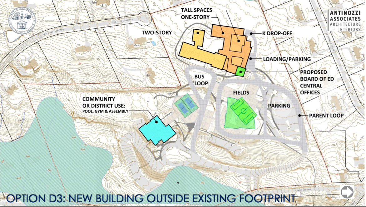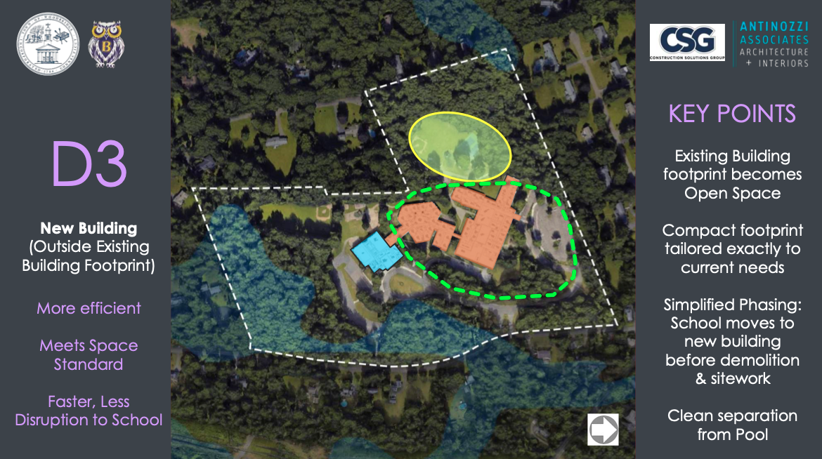 As the review of options proceeded, one configuration — labeled D3 — emerged as the consensus choice. As previously described, Option D3 entails construction of a new school outside the footprint of the existing building, followed by demolition of the current Beecher Road School facilities. Under that plan, the portion of the property presently occupied by the school would become “open space” (see presentation slides for location details).