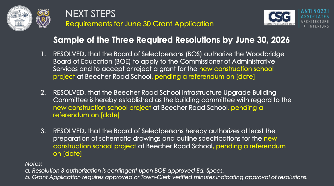 Following that presentation, Madonick outlined the procedural steps required if the town intends to meet the June 30, 2026 state grant submission deadline. She noted that required approvals include Board of Education action, Board of Selectmen review, Board of Finance consideration, and ultimately voter authorization (see sample motions and timeline from the presentation, below).
