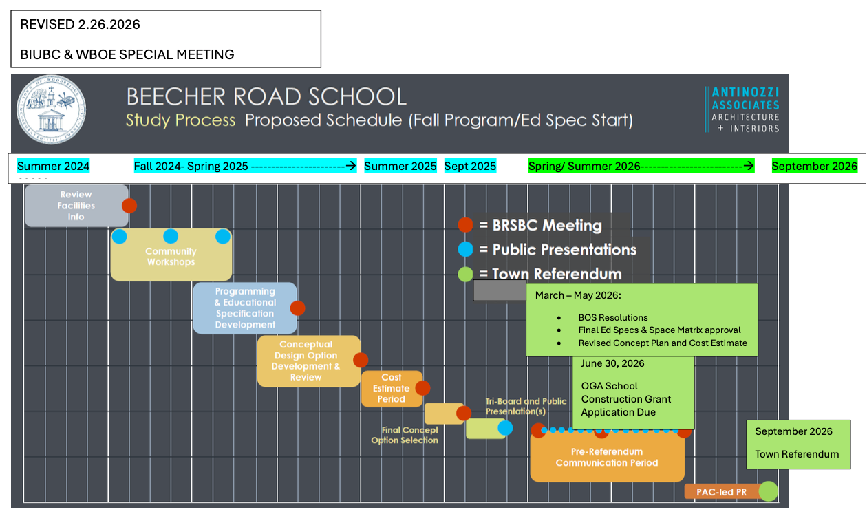 The Town's Beecher Infrastructure Upgrade Building Committee (BIUBC) met February 26 in joint session with the Woodbridge Board of Education (WBOE) to discuss and act upon plans for school facility upgrades. The meeting was held in-person at Beecher Road School's South Assembly Room with one WBOE member attending remotely; no WGATV recording was made of this joint meeting.