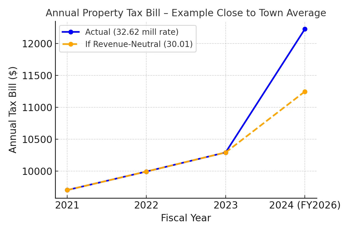 An example tax bill for a property valued close to the town average shows the sharp jump in FY2026 following the revaluation and budget increase that resulted in the current mill rate of 32.62 (blue line) compared with what it would have been under the revenue-neutral mill rate of 30.01 (dotted orange line).