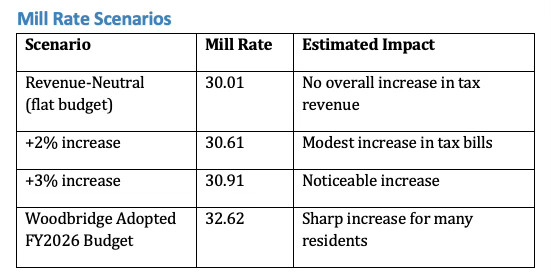 Serving as a kind of fiscal baseline or reference point, the revenue-neutral mill rate can help town leaders and residents more easily understand the tradeoffs involved in spending above that level. In Woodbridge’s case, the estimated revenue-neutral mill rate after the 2024 revaluation was approximately 30.01 mills as noted by the Finance Director at the Feb. 4 Joint Meeting of the BOS and BOF (click the video image below for that portion of the meeting).